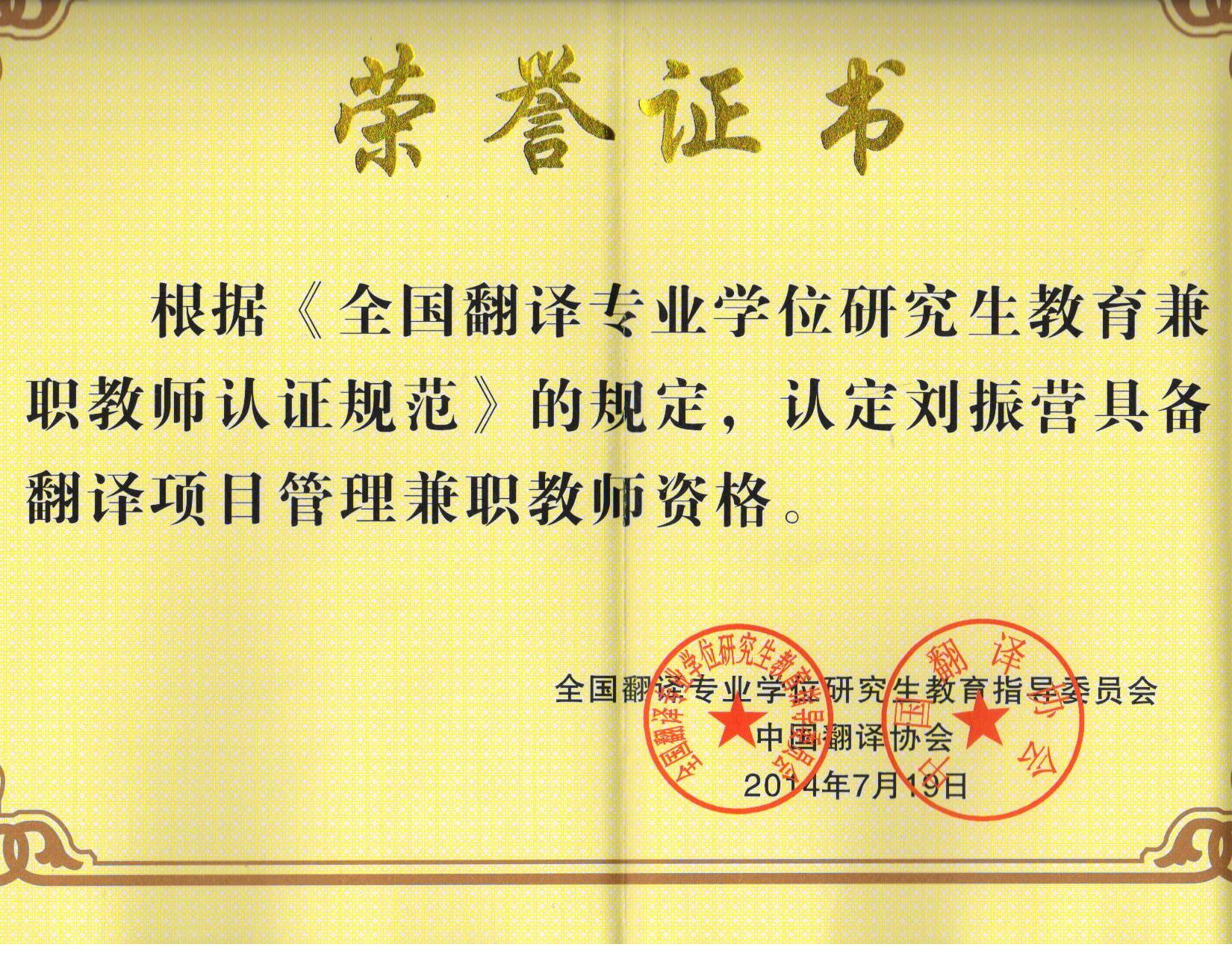 《全国翻译专业学位研究生教育兼职教师资格证书》